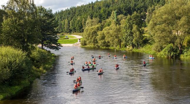 Ďalší deň bola Vltava úplne rovná, vodácky sa to volá „volej“, to znamená že hladina stojí a ty musíš pádlovať ako debil, má to jednu výhodu - nie sú tam kamene a fľašu môžeš ťahať na špagátiku za sebou, chladí sa. Tesne pod hladinou sme zbadali kapra, hovorím svojej drahej: „Drbni ho pádlom budeme mať večer čo jesť“. Ženská logika je ale nepredvídateľná vec. Nesekla ho pádlom za krk ale pleskla ho naplocho. Skoro sme sa vydrbali z vratkej lode vplyvom akcie a reakcie.