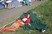 Budíček číslo dva sa koná o 11.00. Von z auta vyliezam rovno s dentálnou hygienou a fľaškou minerálky na oplach. Popri čistení zubov sledujem okolie. Niekto ešte dospáva, určité skupinky už dopĺňajú hladinku a akýsi týpek zháňa nôž na melón. Prezlečený si to štrádujem do gastrozóny na raňajky. Míňam stanové mestečko, kde obyvatelia naprávajú škody spôsobené nočnou búrkou. Niektoré baby iba v podprdách, asi ich riadne vytopilo. Okom čeknem situáciu pri sprchách a dlhý rad pred nimi ma informuje, že mám dosť času na raňajky. Zahľadím sa na dva kolísajúce sa zadky dievčeniec pred sebou do diaľky a stúpam do tyčky. Našťastie som obutý, nie ako niektorí bosí pobehaji. Blížim sa ku gastrozóne a predo mnou sa vynárajú prvé dva dlhé rady. Tieto rady míňam a všímam si, že osadenstvo je čisto ženské. S prekvapením zisťujem, že sú to šóry do kaderníctiev. Toto fakt nechápem, ísť na festival a dva dni nevydržať bez kaderníka. A aby toho nebolo málo, hneď vedľa je holičstvo pre pánov, kde sedia hipsteri s bradami, čo sú ťažko nad vecou a holiči im vyčesávajú zvyšky predošlej noci. To už aj jogín, spiaci poskladaný v divnej polohe pod lavičkou v gastrozóne je mi sympatickejší.