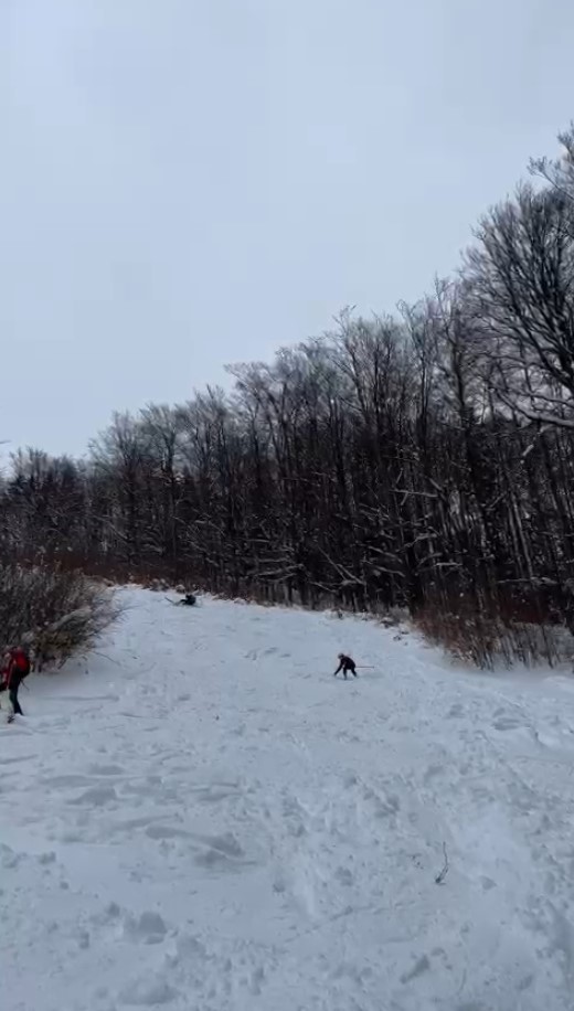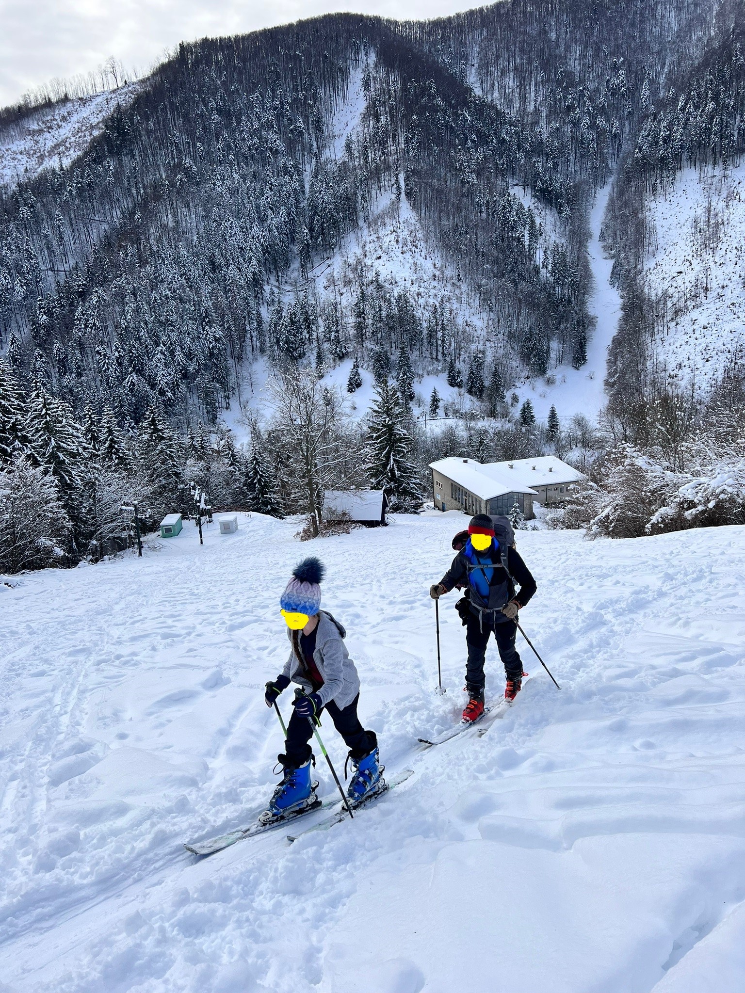 Po cca hodine sa začali dostavovať prvé známky únavy, ale približne po 2-3 prestávkach na čaj a niečo sladké na doplnenie energie sme sa dostali k spodnej stanici poslednej lanovky. To sme za sebou mali cca 2,5 hodiny šľapania a približne 2,5 – 3 km + niečo vyše 400 výškových metrov. Hodinky kolegyne ukazovali na záver 5,5 km a 800 výškových metrov, ale do toho (ak som to dobre pochopil) patril aj zjazd. Krpatej sa síce triasli nohy už aj pri státí ako drahému psovi, keď ho zoberú von na mráz, ale už bola namotivovaná na zjazd. Odstrojenie z pásov a prepnutie krpatej z adaptéra do viazania bolo spojené s miernou akrobaciou. Zastať si na sneh bez lyží znamenalo zaboriť sa 30-40 cm do snehu. Zjazd samotný prebehol v pohode. Išli sme vláčik kde prvá zlyžovala úsek kolegyňa, potom krpatá a následne ja, aby som jej pomohol na nohy ak spadne (čo sa jej párkrát podarilo). Po dvoch takýchto etapách sme zistili, že krpatá ani nečaká a suverénne sa púšťa dole ako prvá, znovu si vychutnávajúc pochvalné komenty. Veď aj mala byť na čo hrdá, zlyžovala to lepšie ako mnoho iných a v neposlednom rade lepšie ako ja, pričom nemala problém ani s hlbokým prašanom a ani so záverečným dojazdom po chodníku v dedine.