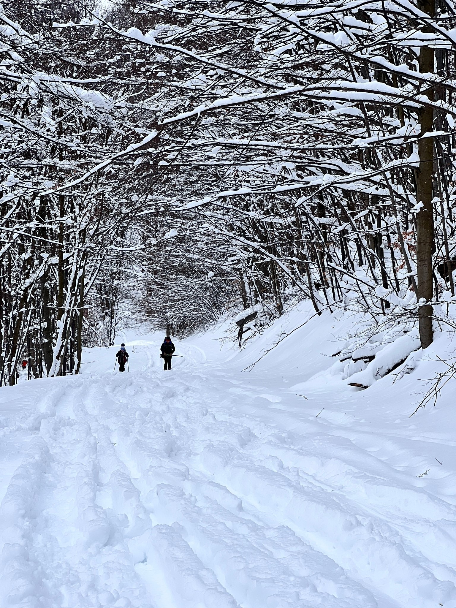 Preniesli sme lyže na odbočku z hlavnej cesty kde končil posyp, zacvakli lyžiarky do viazania a vydali sa na cestu hore. Tempo pohodové, prvých pár metrov spojené s vysvetľovaním krpatej, že nohy treba len posúvať dopredu a nesmie ich dvíhať spolu s lyžami, lebo sa budeme otáčať po 100 m keď už nebude vládať a detailami, ako si prevliecť ruky cez popruh na paliciach tak, aby čo najviac šetrila energiu pri výstupe.