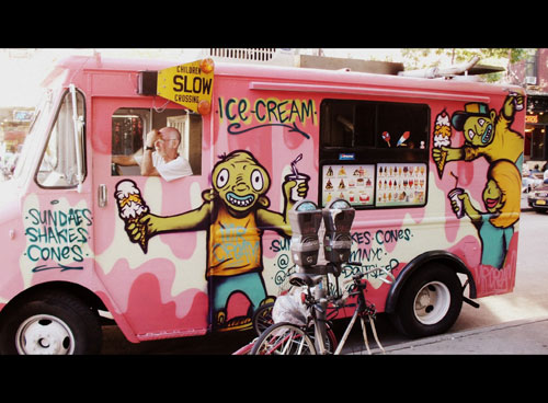 Street art všade, hipsteri všade, Starbucks nikde. Kreditkou v New Yorku zaplatíte aj jeden dolár v automate na metro lístok, ale vo Williamsburgu vám je zbytočná. Cash only. Na ulici si obstarožný pán vyloží obstarožný stolík a predáva platne. Marvin Gaye sa tiesni medzi Rolling Stones a Ellou Fitzgerald. Vedľa stojí stolík s knihami, dve za päť dolárov. Je tu milión malých obchodíkov s predraženým vintage oblečením. Malé kaviarne s minimalistickým dreveným solitérom ponúkajú fair trade kávu fúzatým ľuďom schovávajúcim sa za Macbookmi. Ak vám už doma šklbe kútikmi pri pohľade na niektoré kreatúry v KC Dunaj, ani sem nechoďte. Kde my končíme, oni začínajú. Na každom rohu je obchod s čerstvými kvetmi. Za rohom je park, v ktorom sa koná hudobný festival s voľným vstupom a vystupuje tam napríklad Solange. Nájdete tu bar na streche hotela, z ktorého môžete pozorovať západ slnka nad Manhattanom, teda ak sa vám zunuje sledovať ho z pláže pod ním. Je tu bar Rosemary's, kde dobrosrdečná Rosemary v stredných rokoch berie názov drinku "rum s kolou" doslovne - naleje plný pohár rumu a došpricne to kolou. A zmrzlinárske auto tam vyzerá takto: