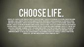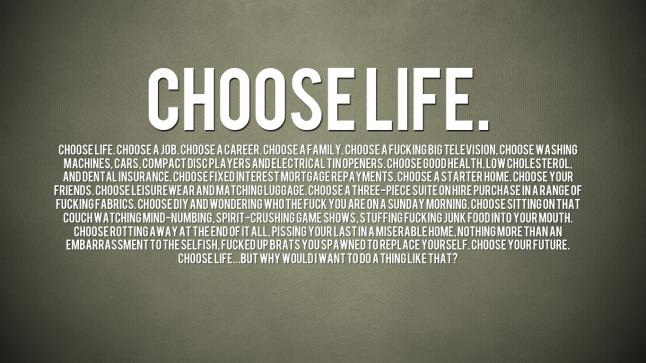 „Choose life. Choose a job. Choose a career. Choose a family. Choose a fucking big television, Choose washing machines, cars, compact disc players, and electrical tin can openers. Choose good health, low cholesterol and dental insurance. Choose fixed-interest mortgage repayments. Choose a starter home. Choose your friends... etc... Choose your future. Choose life.“