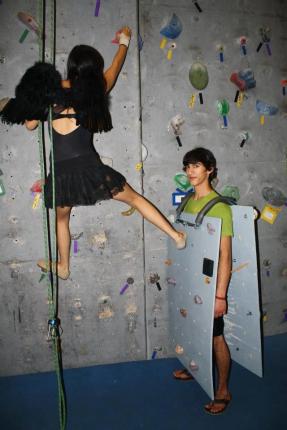 Snažil som sa upokojiť, no na vedľajšej stene v asi dvojmetrovej výške plakala slečna, ktorú sa jej priateľ snažil presvedčiť, že sa výšok nebojí a len si to zle pamätá z detstva. Nie, ja tu dnes veru nezomriem. Pekne to zleziem zase dole. Pohľad pod seba, jedna noha, prikrčiť, druhá noha, pravá ruka sa napína, ľavá ruka márne naslepo hľadá, kde by sa uchytila. Nenašla. Nohy ostávajú na mieste, hlava a lopatky pomaly opisujú kružnicu smerom od steny. Krátky pád, trhnutie, prepočítanie úchytov na stene rebrami a pozvoľné spúšťanie sa až na zem. Oproti prvej stene, kde ma popúšťala moja parťáčka, som si teraz pekne sadol až na zadok a sledoval som úsmevy naokolo.