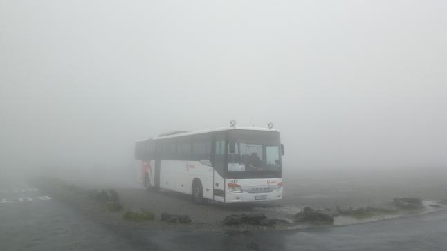Zatiaľ sme mali presne 3, slovami tri, dni keď teplota vystúpala nad dvadsať stupňov. A ja som za to vďačný, pretože klimatizáciu Setry sa nikto neunúval doplniť a na priamom slnku sa z nej rýchlo stáva skleník. Našťastie sa teploty na Nordkappe držia v jednociferných číslach a slnko je veľmi zriedkavý hosť. Obvykle tu máme buď víchričky alebo hmlu tak hustú, že vidíte možno desať metrov pred autobus. Jazdu dolu potom absolvujete tridsiatkou, s vysvietenými hmlovkami aj prídavnými diaľkovými svetlami aj výstrahami a s nosom nalepeným na čelnom skle pleštíte oči do bielej ničoty, z ktorej sa podchvíľou tmavší obrys iného autobusu, stredom cesty si to šinúceho karavanu s vydeseným Nemcom za volantom alebo v stáda neosvetlených, zásadne v tmavých bundách oblečených cyklistov zmietaných vo vetre.