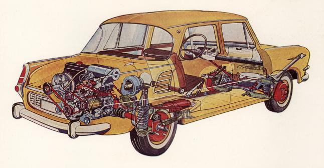 V Československu bolo v 50-tych rokoch budovanie socializmu v plnom prúde, pracujúca trieda si užívala svoju vážnosť a dôležitosť v očiach spoločnosti a strany a takisto sa potrebovala presúvať na modernom automobile. Zadanie znelo jasne. Musí byť ľahké, odviezť aspoň 4 ľudí a spotrebu udržať niekde medzi 6 až 7 litrami benzínu. Vyrobené musí byť z tuzemských materiálov a súčiastok. Keďže v tej dobe u nás nevedeli vyrobiť homokinetické poloosi, koncepcia motor vpredu, pohon vpredu musel ísť zo stola preč. Konfigurácia motor vpredu, pohon zadných kolies bol v tej dobe vnímaný ako zastaralý a cestu si dopredu razila koncepcia všetko vzadu, teda motor, prevodovka a pohon zadných kolies za zadnými sedačkami. Takýto pohon zvolili viaceré automobilky v západnej Európe (VW Chrobák, VW Transporter, Fiat 500, 600, 850, Renault 8). Nultá séria bola testovaná na púšti v Azerbajžane, aj v uliciach Moskvy. V roku 1964 vyšli z brán automobilky prvé sériové Škody 1000 MB. Automobil mal samonosnú karosériu, pretože súdruhovia si neželali žiaden rám, ktorý by zvyšoval hmotnosť automobilu, a tým pádom aj spotrebu. Nezávislé zavesenie kolies na oboch nápravách, pruženie listovými pružinami ostalo v histórii a nahradili ho vinuté pružiny. Zadná náprava bola úplne jednoduchá, kývavá, pri prepružení sa menil rozchod kolies a aj sklon kolesa k vozovke, čo vodičov trénovalo v jazdných skúsenostiach. Keďže bolo celé pohonné ústrojenstvo sústredené vzadu, muselo byť ľahké. A tak škodovka ako prvá zaviedla do výroby motor s celohliníkovým blokom. Až o rok neskôr ju nasledoval Renault.