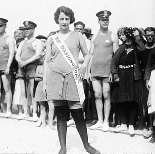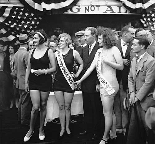 Po prvýkrát usporiadali Miss America v r.1921 v Atlantic City. Cieľom bolo prilákať viac turistov do mesta. Až v r.2006 sa táto show, ktorá medzitým vyrástla do monumentálnych rozmerov, presťahovala do Las Vegas. Na nasledujúcom obrázku sú zobrazené účastníčky súťaže krásy v polovici dvadsiatych rokov minulého storočia.