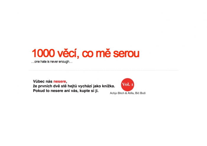 Inspirací nám byla stránka www.1000awesomethings.com, na který jeden Amík popisuje každodenní radůstky a věcičky, kvůli kterejm stojí za to žít. To je bezpochyby výbornej koncept, jenže my jsme si vědomi i existence každodenních vobloží a vopruzů, terý dokážou otrávit celej den, a když ne celej, tak alespoň jeho část. Takže jsme založili 1000 věcí, co mě serou; protože znáš to, radost i starost jsou only real when shared, navíc tak trošku doufáme, že když o těch vomrdávkách budeme psát, že se nám nějak uleví nebo co…