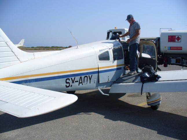 Nakukli sme do radarového stanovišťa (approach), kde Graeme všetkých poznal. Spýtal sa či nie sú nejaké obmedzenia po trase a či sa môžeme ísť pozrieť do veže. Ďalej nasledovala návšteva u riaditeľa, ktorý nám mal schváliť letový plán. Ten bol ale mimoriadne zaneprázdnený dlhým telefonátom, takže po pár minútach mu Graeme vnútil plán, on ho zbežne pozrel a ukázal palec hore. Natlačili sme sa do mikrovýťahu, o dve poschodia vyššie boli točité schody a už sme boli vo veži. Tá bola tiež miniatúrna, zmestil sa tam jeden riadiaci na stoličke a my dvaja postávajúci pri (a na) schodisku. Riadiaci mal v ten deň kľudnú službu, takže sme sa dali do reči. Chlapík bol zo Solúnu, každé leto chodia z pevniny vypomáhať na ostrovy, aby miestni ustáli nápor dovolenkárov. Po asi 10 minútach rozhovoru sme sa rozlúčili a šli von. Za ten čas akurát pristálo jediné lietadlo, inak nič. A ja blbec som úplne zabudol, že v puzdre pod pazuchou som mal foťák! :(