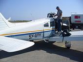 Nasledovala cesta asi 150m krížom cez odbavovaciu plochu k nášmu lietadlu. PA-28-161 Warrior II, registrácia SX-AOY. Mašina určite staršia ako ja, ale dobre udržiavaná. [Rok výroby sa mi nepodarilo zistiť, register lietadiel má v tomto bordel a pre SX-AOY neudáva žiaden rok. FAA tvrdí 1941, ale pre úplne iný model lietadla a pri deregistrácii a predaji do Grécka rok výroby chýba. Tento model sa ale začal vyrábať až v roku 1972]. Ja som začal s predletovou prehliadkou, Graeme zatiaľ telefonoval kvôli tankovaniu. "Kaliméra, avgas parakaló ... né, Aeroleski Rodó ..." - a tam niekde moje (neexistujúce) znalosti gréčtiny skončili a nestíhal som ďalej sledovať [AVGAS = letecký benzín, 100 oktánový, nízkoolovnatý. Moderné stroje už zvládajú bežnú natural 95ku, ale staré potrebujú olovo]. Prehliadku som dokončil, jediný problém som mal s kormidlom - keďže Warrior II ho má fyzicky prepojené na ovládané predné koleso a na zemi s tým proste rukou nepohnem. Graeme tiež obehol lietadlo a odložil batožinu do odkladacieho priestoru. Kým dorazila cisterna s palivom ešte stihol umyť predné sklo. Po natankovaní sme skontrolovali vzorku paliva - toto som nikdy nerobil, takže ma to zaujímalo. Teoreticky sa má palivo kontrolovať vždy po natankovaní, či v ňom nie sú nejaké usadeniny, alebo voda, ale u nás sa na to z vysoka kašle. Samozrejme bolo všetko v poriadku, ale istota je istota. Nasadli sme, kým som si ja pripravil nákolenník a vytiahol checklist, Graeme zatiaľ inštaloval kameru (video mi sľúbil poslať, ale doteraz ho nemám). Od veže som si rádiom vyžiadal povolenie na spúšťanie a dostal som ho. Graeme mi pomohol so štartovaním - nastrekovač paliva som nikdy predtým nevidel [v letectve sú podobné anachronizmy bežné, napr. viac než polovica piestových lietadiel má ešte stále karburátor, dokonca aj moderné modely vyrobené po roku 2010. Ručné nastrekovanie je ale ozaj archaická záležitosť]. Ďalej som pýtal od veže povolenie na let, ale narýchlo som si nevedel spomenúť na volačku lietadla a nevedel sa vykoktať. Nič to, že ju mám napísanú na štítku priamo pred sebou. Povolenie sme ale dostali a obratom pýtame aj rolovanie. Počas rolovania som si vychutnával riadené predné koleso, výrazne jednoduchšie ako diferenciálne brzdenie. Lietadlá, na ktorých bežne lietam majú neriadené predné koleso, takže zabočovanie na zemi sa rieši štýlom tanku - pribrzdením pravého kolesa sa zabočuje doprava, pribrzdením ľavého doľava. Pri vyšších otáčkach motoru a dostatočnom ofukovaní smerového kormidla sa dá použiť aj to, ale bez bŕzd to nie je jednoduché. Graeme ma ale schladil - spýtal sa, či by nemohol komunikovať radšej on. Medzinárodné letisko, rušný vzdušný priestor a aeroklub má nejakú reputáciu u riadiacich ... Smutne som súhlasil; načo mi vlastne je ICAO english level 6? [letecká angličtina na všeobecné lietanie, levely 1-3 sú nedostatočné, level 4 má ťažký prízvuk a obmedzenú slovnú zásobu, level 5 je už postačujúci pre aerolinky a najvyšší level 6 je dobre zrozumiteľný a nevyžaduje pravidelné preskúšania v budúcnosti] Na konci rolovačky sme šli vykonať motorovú skúšku a ja som zabudol otočiť lietadlo proti vetru. Stáva sa. Po motorovke sme vypýtali vstup na dráhu 25 a vzlet, ktorý sme hneď dostali [Číslo dráhy označuje magnetický smer jej osi, zaokrúhlený na desiatky stupňov. Jedna dráha má tak dve čísla, z každej strany jedno - na Rodose sú to 070° a 250°, takže dráha je 07/25. Bratislava má dráhy 04/22 a 13/31, pričom osi sú 044°/224° a 134°/314°. Keďže magnetické pole zeme sa mierne mení, z času na čas je nutné dráhu prečíslovať]. Ide sa na to.