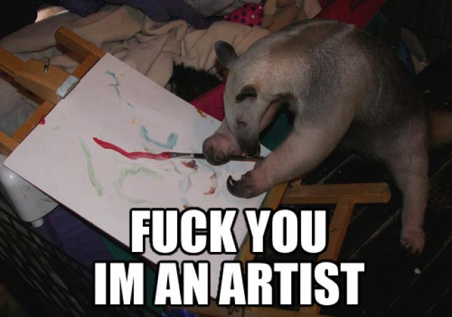 Samozrejme, že len vyššie uvedené nestačí, lebo potom by stačilo nakresliť obrázok dlhovlasej zarastenej osoby, pri ktorej by nebolo zrejmé, či to má byť Ježiš alebo Tibor Elliot Rostas a napísať pod ňu nejakú hlbokú kontroverznú myšlienku, napr. keby pes nesral, roztrhlo by ho; prepašovať to do galérie a prilepiť to na stenu, dať k tomu ceduľku a mali by sme umelecké dielo. No tí, čo sa do umenia vyznajú, vedia, že je tu aj ďalší atribút, a síce, že umelecké dielo musí vyjadrovať myšlienku. Tak napríklad dielo My bed symbolizuje pocity osamelosti a zúfalstva modernej mladej ženy závislej na alkohole, diviacej sa, že ju nik nechce. A Artist´s shit symbolizuje zas zvrátenosť moderného umenia, keď umelci predávajú ľuďom sračky a tvrdia im, že je to umenie.