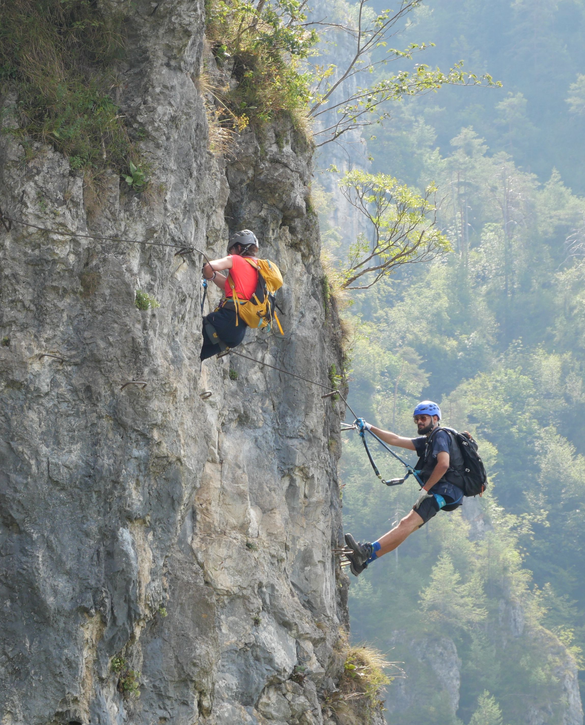 Klik - klak, cvakám karabinky na istiace lano, ferata je označená ako náročnosť D, najľahšie je A. Toto má byť krátka trasa lesom, nejaké D už mám polezené, tak to bude malina. Čo to? Kam mám dať pravú nohu a prečo je skala v previse a ruksak ma ťahá dole? Stať sa Gardistom nebude také jednoduché, ako som si myslel... Pripínam sa odsedákom, nech si ruky odpočinú. Zjavne som podcenil zhybovú prípravu. Po chvíli pochopím úmysel staviteľa feraty, nájdem tie správne pevné body a pokračujem už plynule. Po každej tažšej časti je možnosť vzdať sa a ustúpiť lesom, to by ale znamenalo dishonorable discharge. Nevrešti! V záverečom traverze sa naskytnú pekné pohľady na jazero, ktoré mi kazia len dve veci: kvapkajúci pot spod prilby, sprvu len keď skloním hlavu, neskôr trvalo stekajúce kropaje a nejaké vrieskanie. Samozrejme, všetci prejdú feratou potichu, len nejaká česká banda si musí uvoľňovať napätie hlasným krikom a hodnotením náročnosti trasy. Po hodinke a pol som späť pri aute, chystám sa na poslednú časť triatlonu, ktorou je plávanie v slipkových plavkách v jazere, nadmorská výška 655 metrov, teplota 23 stupňov. Úplne prepotené oblečenie (Nevrešti!) si prezliekam za dverami auta a konečne sa príjemne schladím. Jazero je povestné svojou čistou a priehľadnou vodou, len pre deti príliš vhodné nie je, aj blízko brehu tvorí dno strmý kamienkový svah.