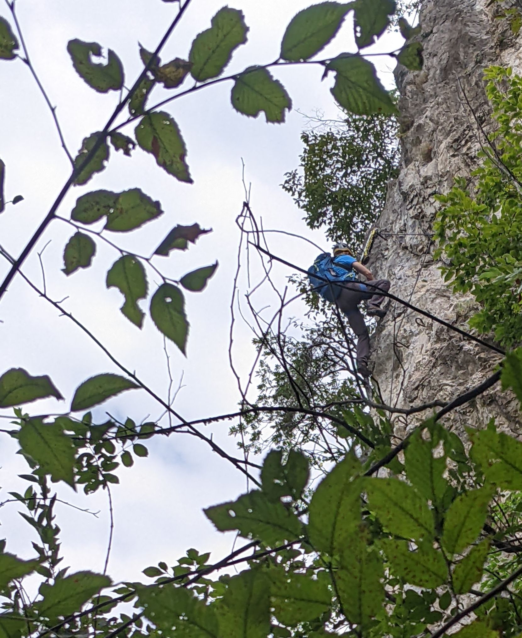 Konečne po hodine jazdy jazero, aj parkovisko pri opičej dráhe je označené a zadarmo. Už teraz mám tričko aj slipky celé prepotené. Nevrešti! Predpisovo sa ustrojím, vzhľadom na teplotu okolo 30 stupňov veliteľ povolil taktické kraťasy. Podľa fotiek som aj tak zvolil dlhé nohavice. Navliekam si postroj, prsný úväz, pripínam tlmič a odsedák, nahadzujem ruksak, nasadzujem prilbu. Na začiatok feraty je to pár minút lesom, sprevádza ma navigátorka s úmyslom dokumentovať moje hrdinské činy.