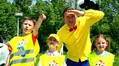 Takže hneď v úvode narážame na medveďa a Mášu, vraj nám už mávajú. Zblízka. No mňa osobne trochu desí všetko ruské, čo máva zblízka, ale deti vyzerajú spokojne, tak čo. Miro ale zachováva duchaprítomnosť a ženie „cieľovku“ do vlaku, asi preto, aby ich medveď nezožral. Aby dosiahol správny výchovný efekt, pred nástupom vyfasujú lístky. Ďalej tu máme reklamu na mimoňov a Elzu, Pata a Mata, Snehulienku... Tá mi je výzorom dosť povedomá, ak niekto vie, kto to je, dajte vedieť. Miro sa predstavuje v úlohe rušňovodiča, jazdí na dúhe, aj po tráve... A všade. Potom v úlohe balónového pilota, potápača, ide mu to asi tak ako spev.