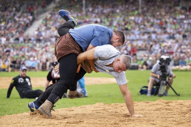 A tým sa dostávame k najdôležitejšej súčasti festivalu, tradičnému švajčiarskemu zápasu “Schwingen”. To po nemecky znamená hojdať sa, kývať sa, či kymácať sa - a skutočne, keď sa súperi chytia za pasy, tak sa na začiatku, kým hľadajú tú najlepšiu pozíciu, kymácajú skoro ako dvaja kamaráti z mokrej štvrte, čo nadránom hľadajú cestu domov.