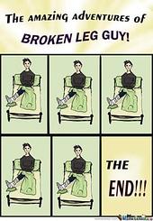 Najbližší mesiac som teda strávil doma na homeoffice, poobede a po víkendoch nevediac čo už od dobroty robiť. Raz denne som v rámci vzdoru išiel vyvenčiť psa sám (inak mal vždy nejakého dogsittera), tridsaťosem metrov na lúku, sadnúť, hádzať loptičku, tridsaťosem metrov a jedenásť schodov naspäť. Pravé lýtko sa mení na pletienku, ľavé kompletne atrofuje a ako mi začína členok odpúchať, tak sadra na nohe "tancuje" a bolí ma každý pohyb. Tretí deň, vracajúc sa z daždivej prechádzky si sádru po ušmyknutí na mokrej dlažbe zlomím priečne. Prvý reflex bol samozrejme postaviť sa na obe nohy, ale tak aspoň som nedrbol a nezlomil si niečo ďalšie. Kamarát lekárnik má zásobil kopou dobrôt, ktoré majú urýchliť moju liečbu a dal mi pár tipov.