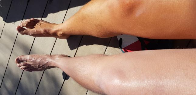 Dôkaz č. 1 : Biela noha natretá, hnedá nenatretá. Autor použil svoje vlastné nohy (pekné, však?) na ilustračné účely.