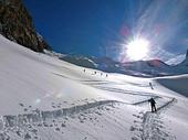 Cesta hrebeňom je spočiatku v pohode, v snežniciach sa mi ide celkom pohodlne. Po chvíli prichádzam medzi skaly, kde nie je dosť priestoru na snežnice a tak ich dávam dole a vravím si, že to bude v pohode. V pohode to moc nie je, ale aj tak idem ďalej, pokým nie som pri skale, z ktorej treba asi meter aj pol zoskočiť. To by nebol problém, len vpravo je priepasť a vľavo je dosť strmý svah so skalami a plošina je široká asi pol metra. Chytím sa skaly vedľa seba, pomaly sa spúšťam dole, keď zrazu gravitácia prestane fungovať. Chcem sa pohnúť nižšie, ale neznáma sila mi v tom bráni. Nakoniec zisťujem, že to nie je zásah vyššej moci, iba sa mi snowboard na ruksaku zachytil o skalu a ja sa neviem pohnúť. Spomeniem si na všetky lekcie jogy, ktoré som absolvoval, teda na žiadnu a nie som na tom o nič lepšie. Nakoniec to dopadne tak, že objímem skalu vedľa seba, odrazím sa nohami, vyhodím chrbát a zadok do vzduchu a tým vyslobodím ruksak. Pri tomto procese mi vypadne fľaša, pozerám, ako sa odrazí od skaly, dopadne na plošinu, odrazí sa a letí dolu do priepasti. Hneď sa menej bojím. Na skale visím tak blbo, že aj tak už nemám inú možnosť, ako nejak zoskočiť na plošinu, tak to spravím a dokonca dopadnem tam, kde som chcel a nešmyknem sa. Šťastie praje nepripraveným. Som v prvom žľabe, do druhého by to malo byť maximálne sto výškových metrov. Chcem pokračovať hore. Predo mnou je skala a stopy človeka, ktorý tade šiel včera. Nemám postavu basketbalistu, ale aj tak mal tento človek podľa môjho odhadu tak dva aj pol metra, pretože vidím jednu stopu pod skalou a jednu nad. Postavím sa do dolnej stopy a chcem dať nohu do hornej, ale pri maximálnom rozkroku, akého som schopný mi chýba minimálne tridsať centimetrov k hornej stope. Ak týpek nemal dva aj pol metra, tak to potom mohol byť iba Van Damme. Nie som schopný pokračovať hore, lebo skala sa obísť nedá a stúpiť nemám kam. Vracať sa tade, kade som prišiel tiež nevyzerá ako dobrý nápad a tak mi ostáva iba pustiť sa do žľabu, o ktorom nemám predstavu, ako vyzerá. Volám kamarátovi Robovi, ktorý to tam pozná a pýtam sa ho na žľaby z Troch Kôp. Vraví nech prvým nejdem, veľa skál. Presne to, čo som potreboval počuť. Asi desať minút sa hrám s myšlienkou poslať rodičom smsku, kebyže to náhodou neprežijem, ale načo ich strašiť. Tak sa teda púšťam.