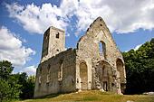 Tesne pred koncom turistického chodníka začína drastické stúpanie a treba prejsť asi 50 metrov do strmého kopca. Prirovnali by sme to k vyšliapaniu všetkých schodov v bratislavskom Auparku, úplne zdola až celkom hore. Tam už prichádzame celkom blízko k zrúcanine kláštora. Je to zvláštna stavba a je ozaj zrúcaná a to tak, že jediná ako tak celá vec je vysoká veža, kde vraj možno jedného dňa bude turistická vyhliadka. Fotka číslo jeden a dva, t. j. prvá a predposledná - pohľad na vežu kláštora. Výška je 30 metrov, zdola sa nám to zdalo celkom dosť.