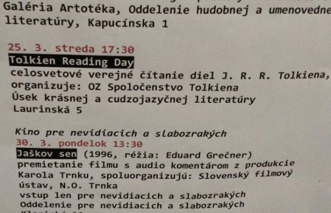 Prednenávnom tu bola prezentovaná pozvánka na akciu TRD. Investigatívne krídlo DM sa rozhodlo zúčastniť sa a podať report, ktorý práve čítate. Na začiatku nik neurčil, kto vlastne tvorí to investigatívne krídlo. A tak účasť prisľúbilo viac, možno až veľa DM ľudí. Bál som sa, aby sme netvorili viac ako polovicu zúčastnených. Stoličiek i ľudí však bolo dosť a tak sa obavy po príchode rozplynuli. Navyše podaktorí z nás prišli len na polovicu, či, nanešťastie, ochoreli a nezúčastnili sa, prípadne nás ani nenašli. Ostatní prítomní, ako sa ukázalo v dávkovanom kvíze medzi jednotlivými čítaniami, boli väčšinou znalci Tolkienovho diela a povyhrávali maškrty či mrkvu alebo pavúka.