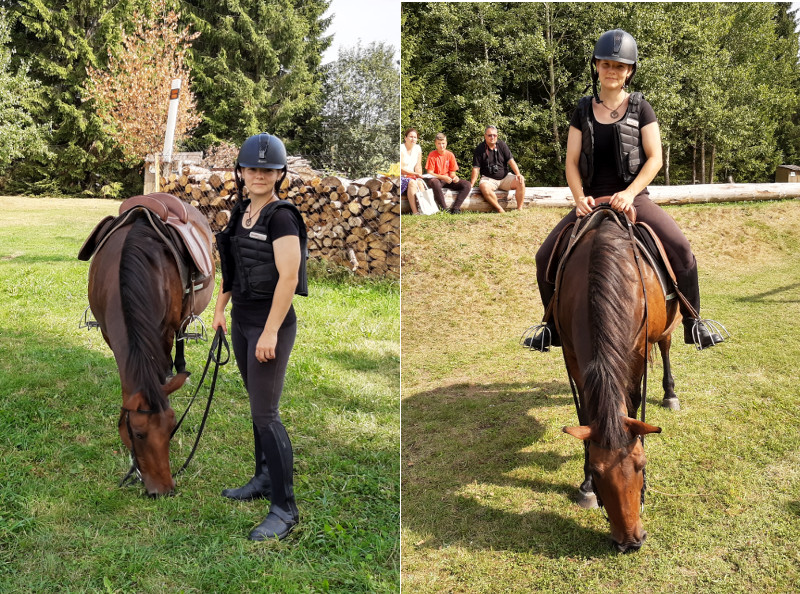 Ďalej sa nainštaluje sedlo, pod ktoré patrí podsedlová dečka a ktoré sa zapína popod brucho podbrušníkom. Všetci účastníci používali sedlá anglické, len ja som si doniesla španielske bezkostrové sedlo, čo mám na moju veľkú bielu kobylu. Nemá totiž vnútri výstuž a preto pasuje na hocijakého koňa s ľubovoľne širokým chrbtom. Mne sa veľmi páči dizajnom a je pre mňa aj veľmi pohodlné. Ako posledná sa dáva koňovi uzda a môžeme ísť. No, vlastne ešte tak úplne nie. U jazdca sa očakáva slušné primerané jazdecké oblečenie a ochranný výstroj. Ten je u detí povinný, juniori majú tuším povinnú prilbu a dospeláci na tejto súťaži podľa vlastného uváženia. Ja nosím aj prilbu aj ochrannú vestu. Predsa len som matka dvoch detí, kam by sa bezo mňa podeli, všakáno. Inak čo sa týka výstroja koňa i jazdca, je táto disciplína veľmi civilná. Žiadna snobáreň, kde je človek za chudáka, ak kôň nemá zladenú podsedlovku s ušaňou a chráničmi na nohy; to všetko, samozrejme, značkové. Koňovi netreba na uzde čelenku so Swarowski kryštálmi a jazdec nemusí mať snehobiele rajtky, luxusný žaket ani nablýskané čižmy (ono by to na tých huculoch aj tak vyzeralo srandovne). Dôležitá je bezpečnosť výstroja, vzájomné porozumenie a spolupráca koňa a jazdca.