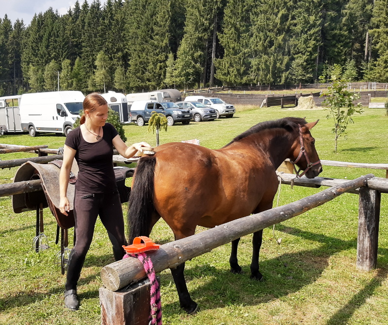 To znamenalo očistenie srsti (poriadne, lebo ak pod sedlom ostane hrubší prach, môže sedlo koňa odrieť na chrbte), vyčistenie kopýt (kvôli hygiene, ale aj možným zašliapnutým skalkám z výbehu, ktoré by mohli spôsobiť otlaky a krívanie), učesanie hrivy (aby sme boli pekné).