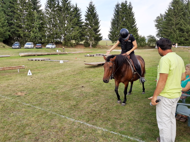Deti mali len 10 prekážok na miestnom futbalovom ihrisku. My ostatní sme mali ešte ďalších 7, resp. 8 rozmiestnených v okrajovej časti areálu. Čo bola tiež výzva, pretože kôň musel odísť od ostatných koní a motať sa pomedzi veľké stohy sena po všelijakých uličkách. Celkovo to bolo také trošku bububu, tá druhá časť, pre psychiku koňa. Juniori končili 17. prekážkou, dospeláci mali ešte taký malý parkúrový skok na záver.