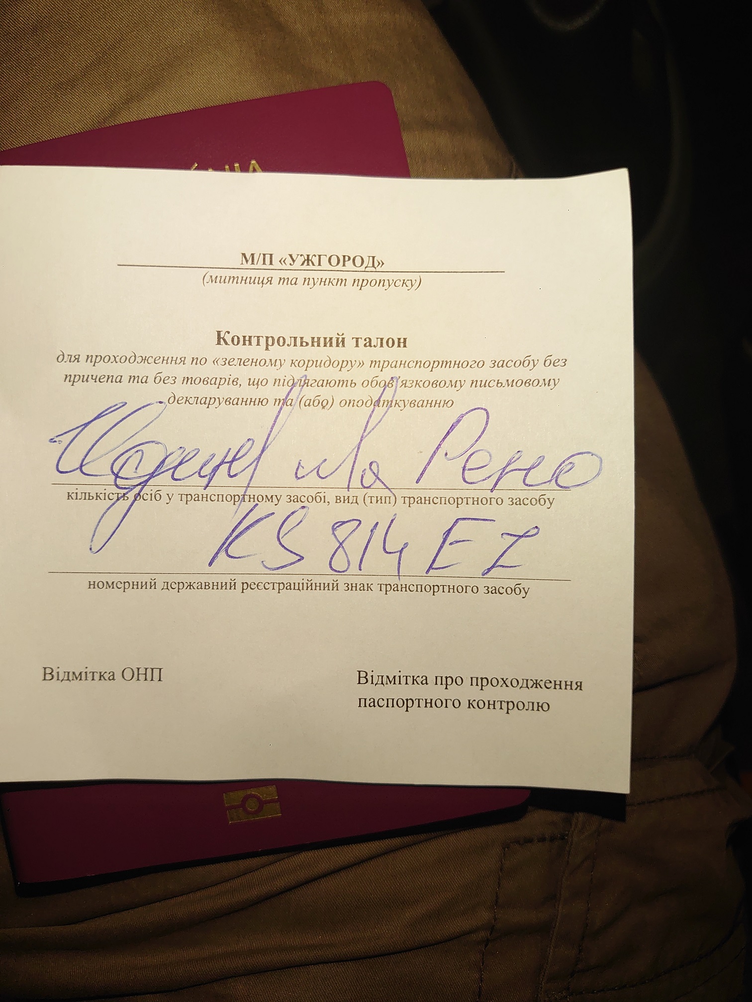 Tak zhruba po hodinke sa dostávam na váhu, kde vypisujem prvé papiere, následne dve rýchle výstupné colné kontroly (ešte stále na SK strane). Tesne po dvanástej sa prískokom dostávam k búdke, kde už je mladý ukrajinský pohraničník. Kamionisti (všetko ukrajinci) chodia do duty free shopu, vojačikovi len čosi zamrmlú, on im súhlasne odkýve a idú. Tak idem aj ja, možno tam budú mať záchod, už tu trčím tri hodiny. Nemali. Cestou späť ma pohraničník zastavuje, že som sa ho nepýtal, či môžem, že takto to nejde. Tvári sa prísne, ale na hlase mu cítiť, že z toho vedu nerobí. Vypisuje mi papierik, asi 10x10 centimetrov, tzv. „taľon“. Neskôr zisťujem, že je to jeden z najdôležitejších dokumentov, predkladá sa pri každej kontrole a každému colníkovi, chráň satan ho stratiť.